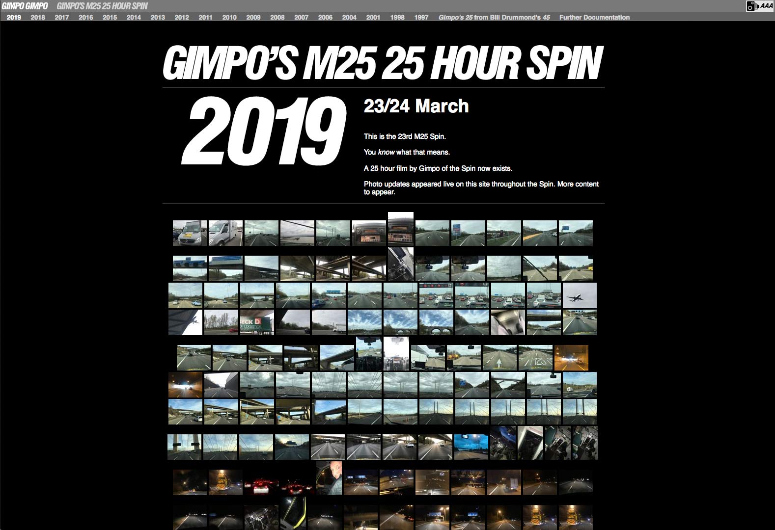 Gimpo has driven the 2.5 hour loop of London's M25 Orbital 25 hours every year for almost 25 years. Each time he documents it with a 25 hour film.